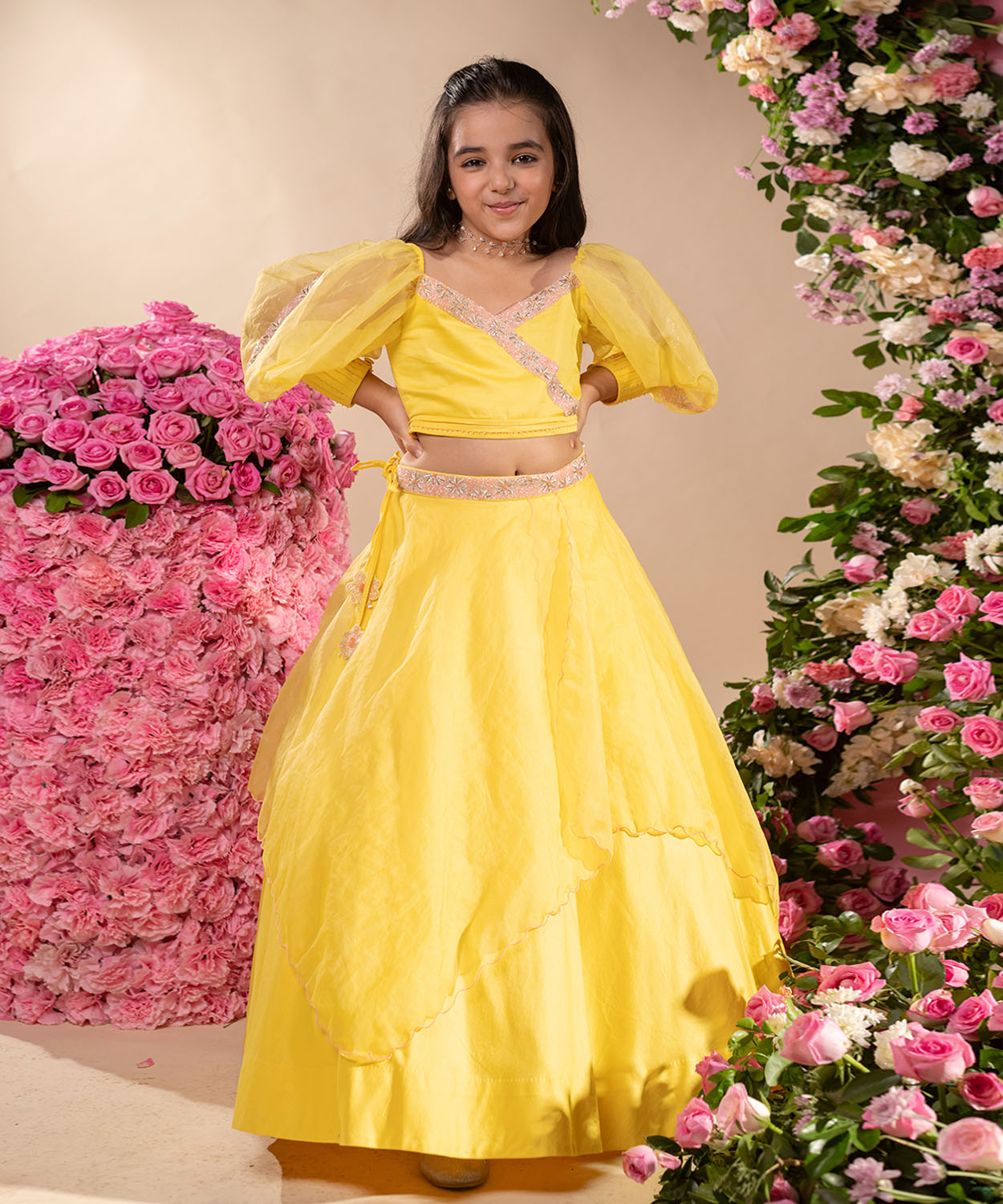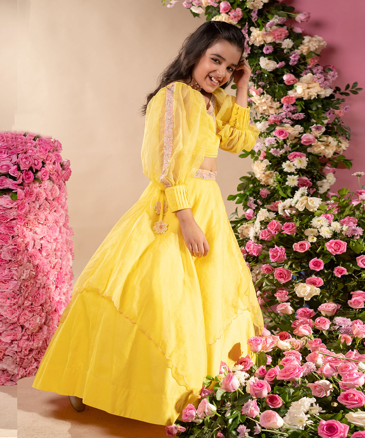 Afsoon-Embroidered Vegan Silk Yellow Blouse Lehenga Set Of 2