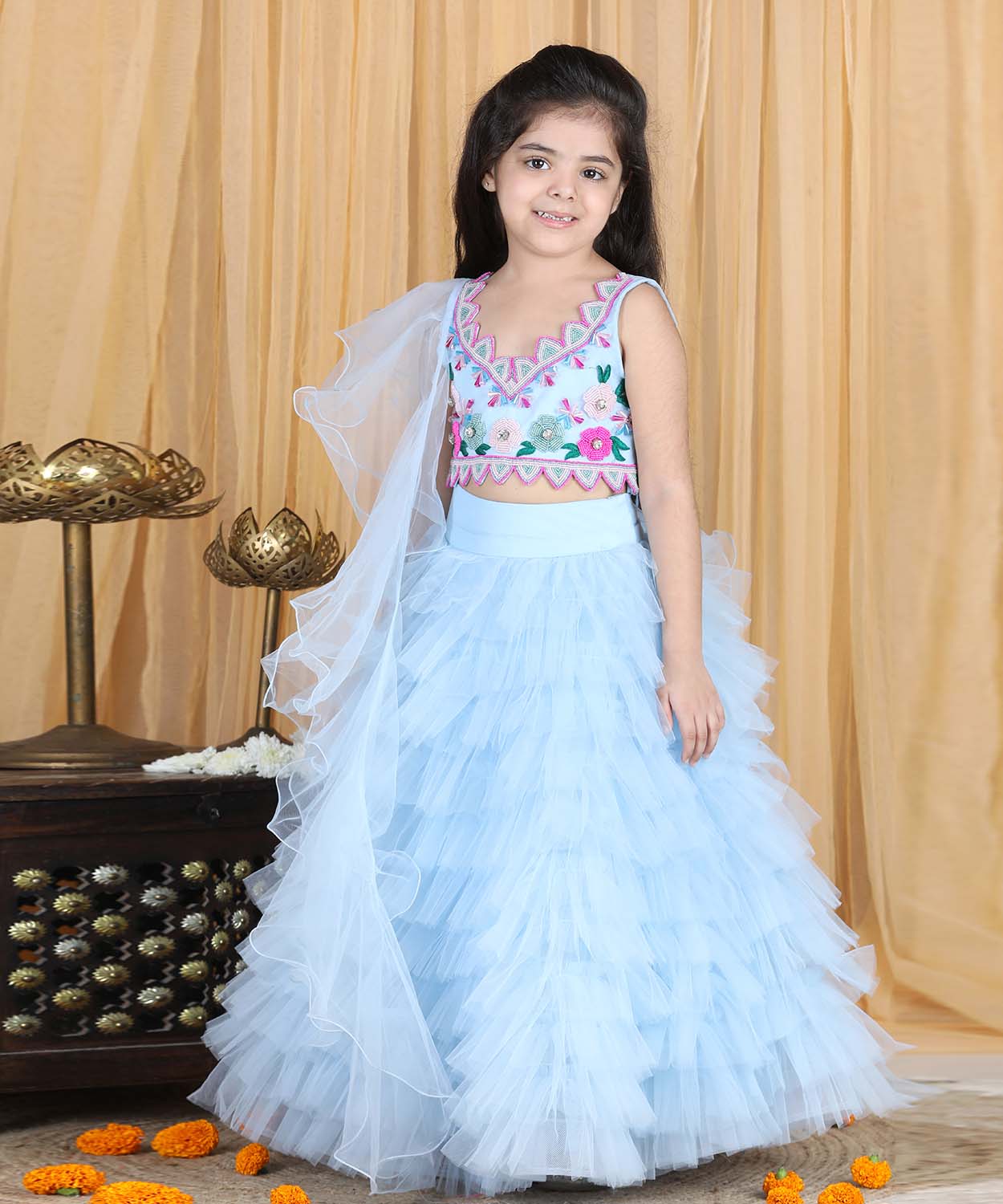Blouse With Hand Embroidery And Tulle Lehenga And Dupatta