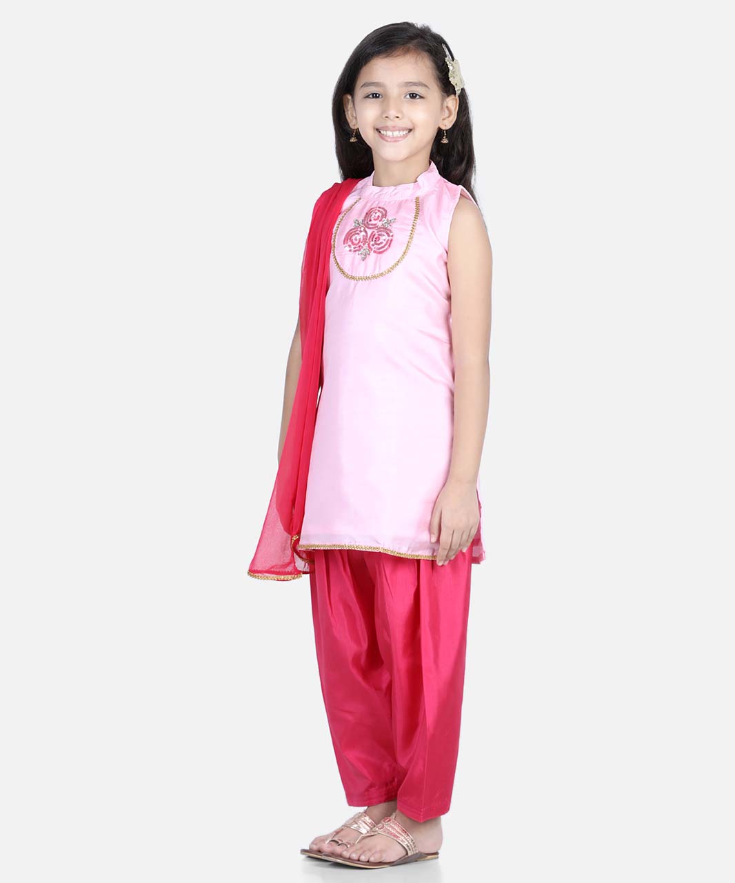 BownBee Hand Embroidered Silk Kurti Salwar for Girls-Pink