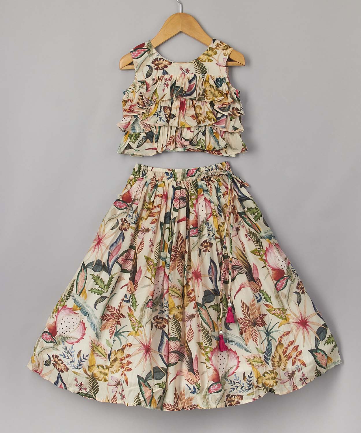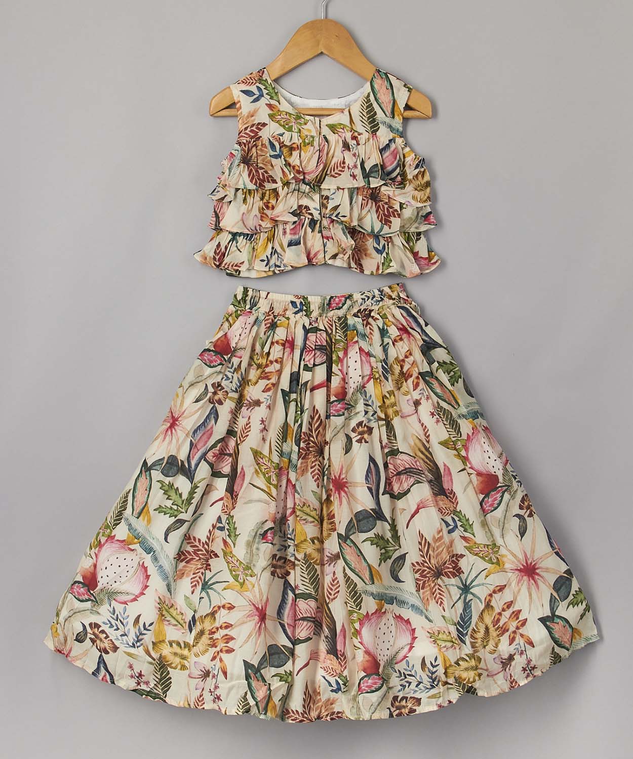 Floral Printed Frilly Layered Top With Pleated Lehenga