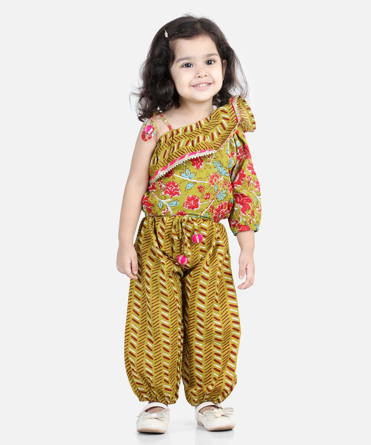 Printed One Sleeve Ruffle Top & Harem Pant Co Ords Sets