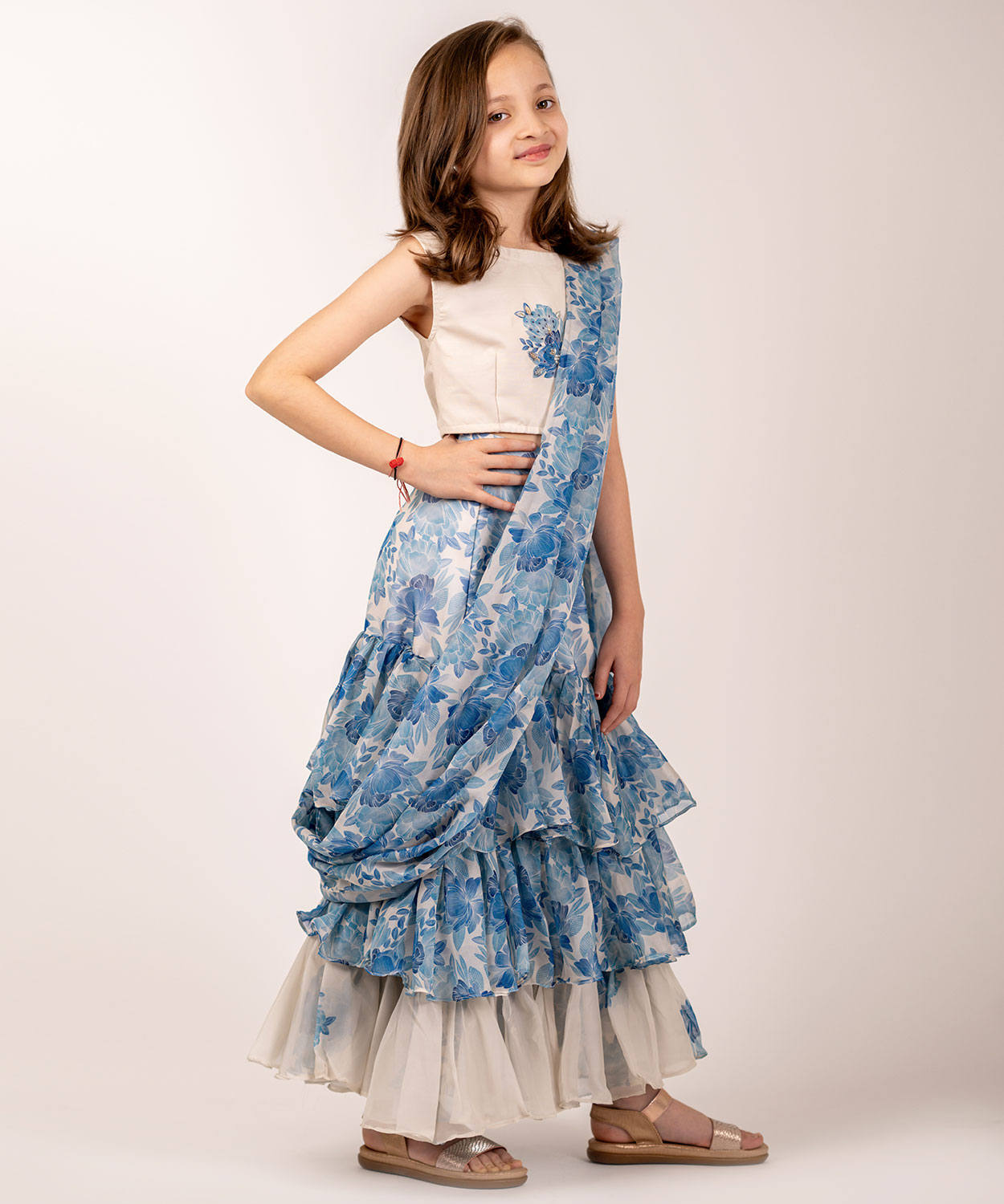Seashell Cream Ruffle Saree Kids