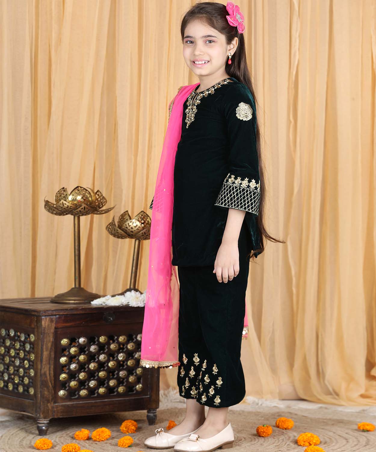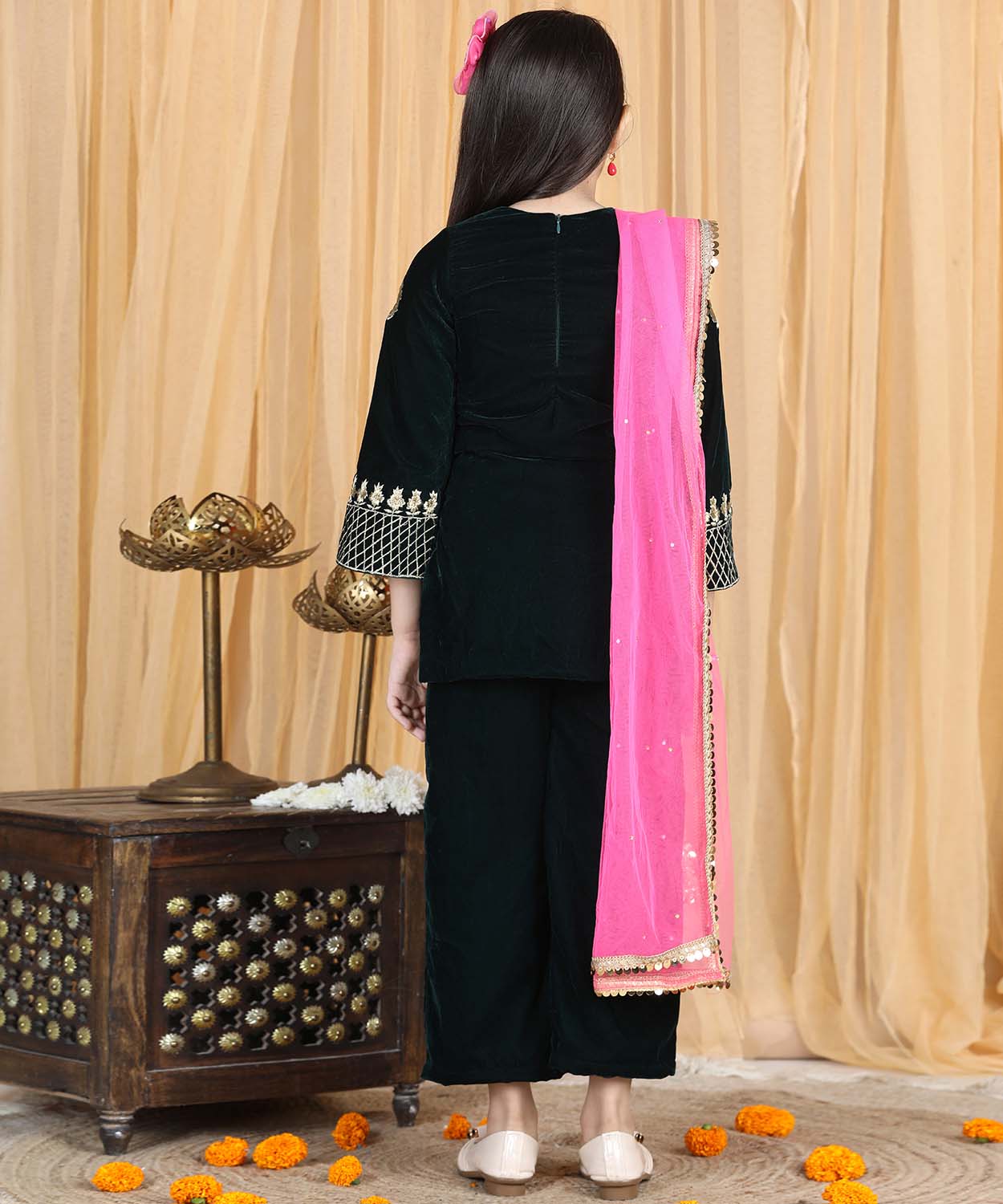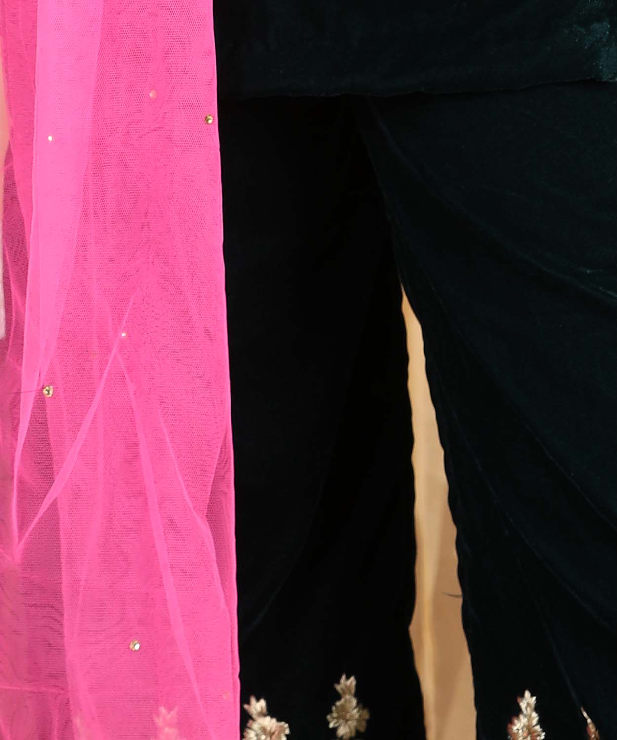 Velvet Suit With Zari Embroidery On Top And Bottom And Net Dupatta