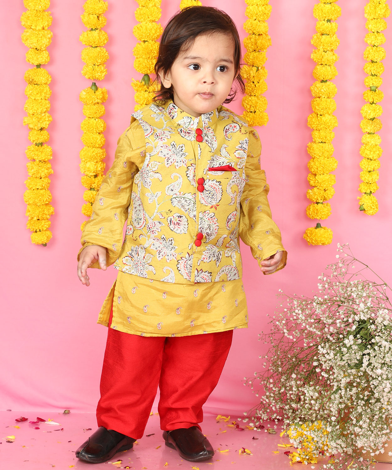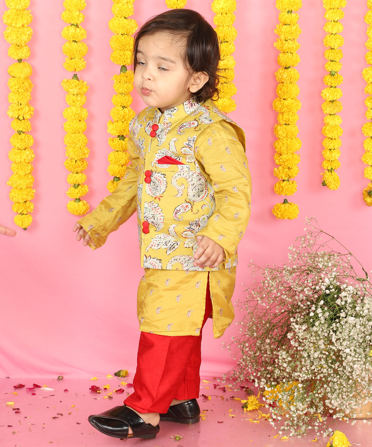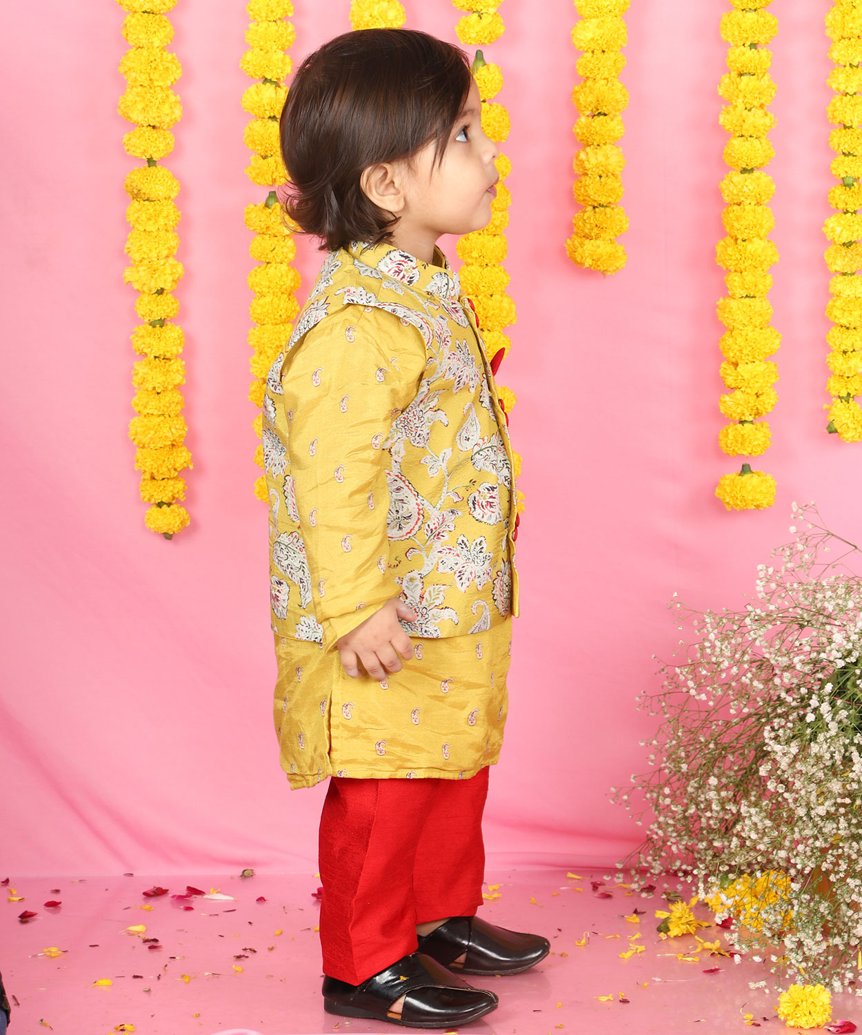 Yellow Kurta With Off White Floral Jacket And Pyjama